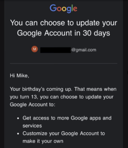 According to Google, a parent would receive an email before the child’s birthday about their ability to have an unsupervised account.