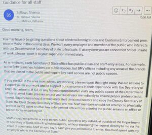 Even more alarming was what happened the same day the confidential plates were revoked. Bellows issued an internal email instructing state employees to actively monitor ICE activity and report it directly to her office, not only inside government buildings, but in the surrounding areas as well: