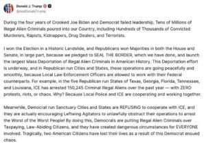 “Democrat Politicians must partner with the Federal Government to protect American Citizens in the rapid removal of all Criminal Illegal Aliens in our Country.”