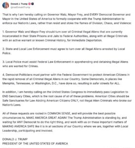 In addition, I am hereby calling on the United States Congress to immediately pass Legislation to END Sanctuary Cities, which is the root cause of all of these problems. American Cities should be Safe Sanctuaries for Law Abiding American Citizens ONLY, not Illegal Alien Criminals who broke our Nation’s Laws.