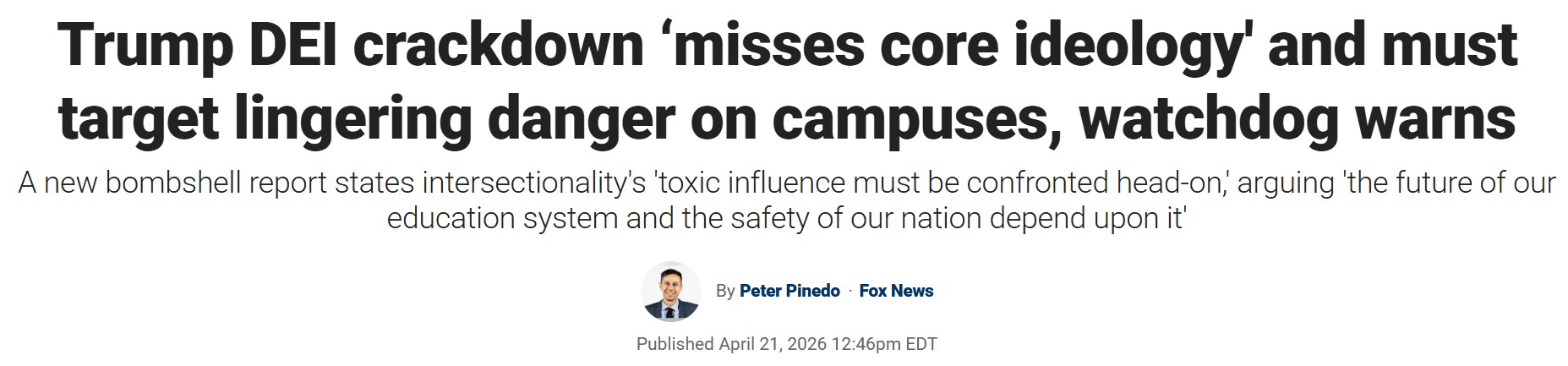 While the report says the Trump administration’s efforts to address DEI thus far are “laudable,” these actions continue to be flouted so that the U.S. educational system remains “the mechanism for intersectionality to embed in the culture.”